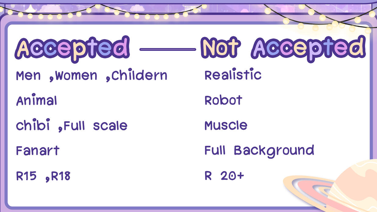 | ✿ This commission may be streamed on Twitch and used as an example in a portfolio. (If you don't want it, please inform us in advance) | ✿ อาจสตรีมงานคอมมิชชั่นนี้บน Twitch และใช้เป็นตัวอย่างในพอร์ตโฟลิโอ (หากไม่ต้องการโปรดแจ้งล่วงหน้า) |